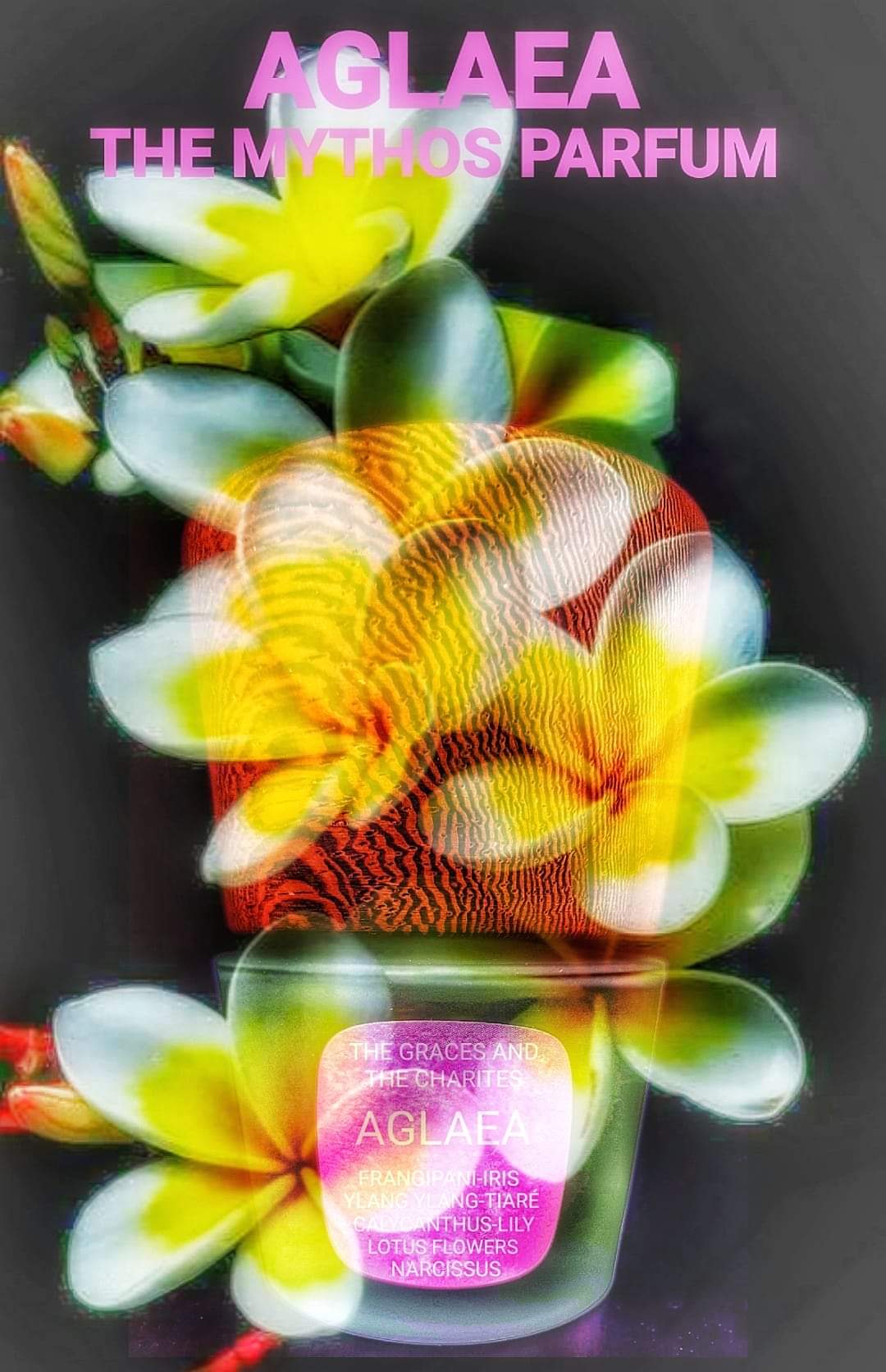 Aglaia è una delle tre Grazie; rappresenta l'ornamento e lo splendore. Mentre Talia era concentrata nel migliorare le condizioni fisiche degli esseri umani Aglaia invece rappresentava il gusto armonico delle cose e dei luoghi. Dove camminava Talia crescevano fiori; dove passava Aglaia tutto diventava adornato, preciso, e di un gusto meraviglioso. La sua visita lasciava sempre anche delle tracce di un profumo di fiori intenso molto simile al frangipane che rimaneva nell'aria per giorni e giorni. A questa ninfa in effetti era sacro questo fiore che rappresenta la femminilità, il candore e la purezza ma con una tenacia unica che contraddistingue solo una vera donna! Mentre la sua pelle candida profumava naturalmente di frangipane, al suo passaggio ogni luogo era adornato da iris bianchi e narcisi gialli e l'aria profumata di ylang-ylang....significava che li era stata la donna che crea armonia e serenità!