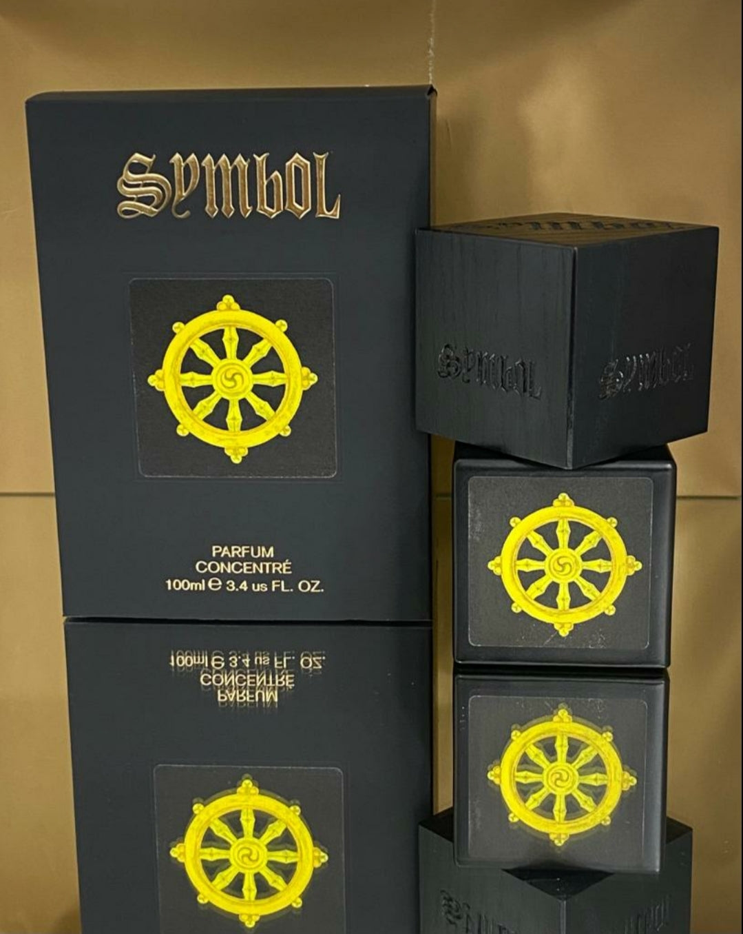 La Ruota del Dharma è uno degli "Otto simboli di Buon Auspicio" diffuso in Tibet, in India ed in Cina del Buddhismo. Secondo la legge del DHARMACAKRA gli esseri viventi sono incessantemente esposti alle sofferenze dalla nascita alla morte; la causa di queste sofferenze è determinata dell'attaccamento che noi proviamo verso tutte le cose, per i nostri stati d'animo, principalmente paure e desideri. Per porre fine ad ogni sofferenza bisogna sconfiggere tre veleni principali: ignoranza, ira e attaccamento. L'ignoranza si sconfigge capendo qual'è la vera nostra reale natura e la vera natura della mente, l'ira va sconfitta facendo capire a noi stessi e agli altri che abbiamo tutti una stessa natura e l'attaccamento si sconfigge praticando quanto indicato dall'Ottuplice Sentiero. La Ruota della Dottrina o Ruota della Legge o Ruota del Dharma è il simbolo che racchiude tutto ciò che stato detto. La ruota è costituita da tre elementi essenziali: il mozzo, i raggi ed il cerchio. II mozzo è il motore immobile, l'essenza primordiale della mente, il cerchio è il mondo tangibile e il suo continuo perpetrarsi fino a quando non sarà sconfitta l'ignoranza, i raggi rappresentano l'Ottuplice Sentiero per conseguire l'essenza della mente. La descrizione olfattiva di questo simbolo così pregno di significati è strutturata in questo modo; le note di testa identificate con una delle tre parti della ruota cioè gli otto raggi si declinano in otto materie prime una per ogni azione retta da compiere: cardamomo, labdano, chiodi di garofano, legno di cedro, betulla, amyris, legni sacri, semi di ambretta. Le note di cuore di questo simbolo sono identificate con la ruota stessa, il cerchílio, che rappresenta il continuo accadere delle cose nel mondo tangibile: vetyver, cuoio, cypriol, miele in un continuo contrasto dolce amaro, carnale ed etereo com'è la nostra esistenza. Le note di fondo del profumo sono identificate con il mozzo del DHARMA cioè il motore immobile l'essenza primordiale della mente a cui dobbiamo tendere durante il nostro percorsa di vita: patchouli, sandalo, muschi, note animali, legni dell'offerta con un odore carnale, estatico quasi ipnotico che ci trasporta in una dimensione olfattiva tale da poter riflettere su come raggiungere il DHARMACAKRA cioè l'insegnamento del BUDDHA per vivere correttamente.