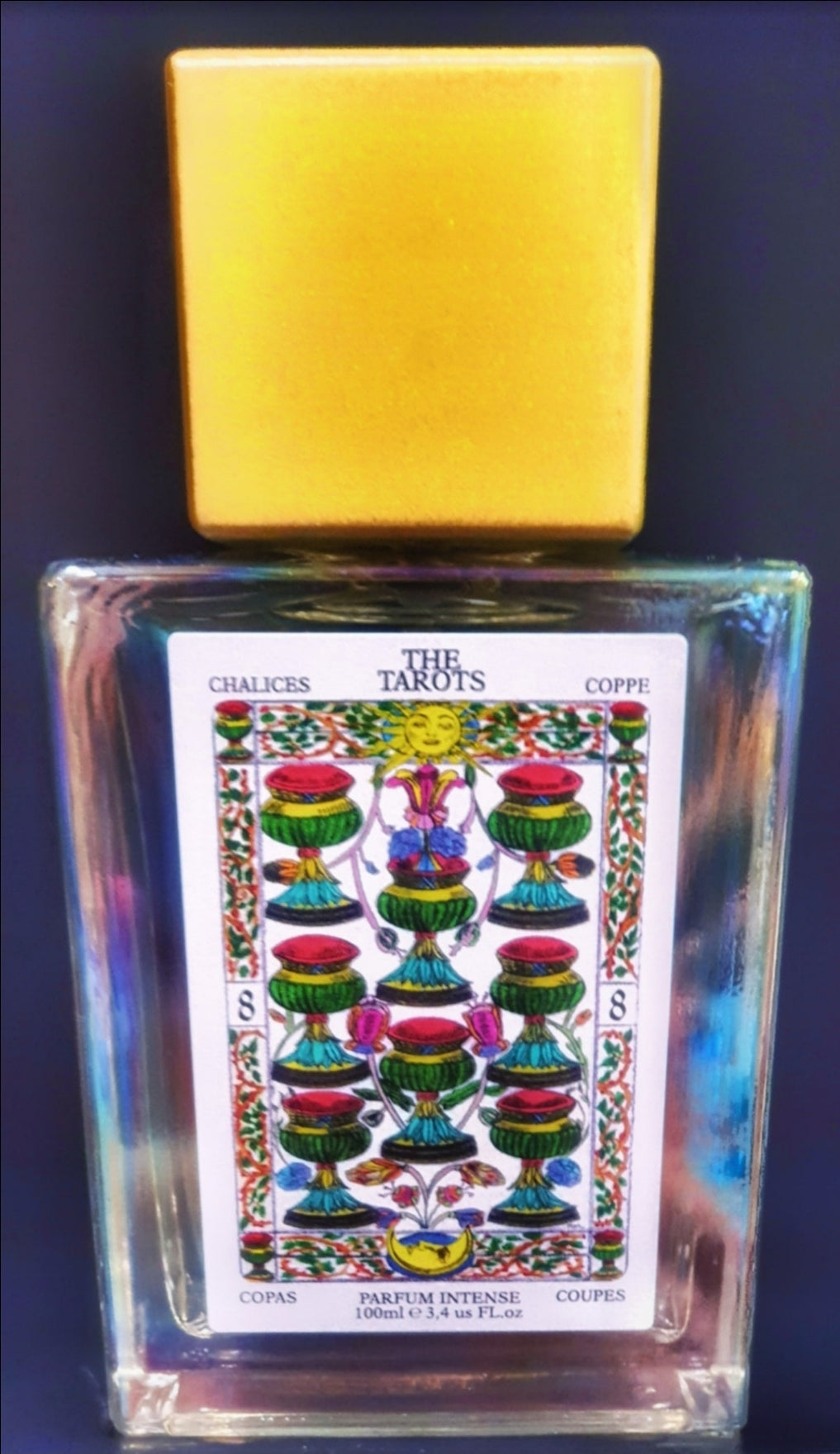 La carta-profumo degli arcani minori,dei semi delle coppe,n.8,della linea di profumeria artistica THE TAROTS PARFUM significa:amore eterno, equilibrio cosmico e inarrestabile evoluzione delle cose.Il numero otto rappresenta una evoluzione continua delle cose,le coppe sono identificate con i sentimenti d'amore,l'OTTO DI COPPE significa che lo sviluppo delle emozioni affettive sta prendendo il giusto percorso inevitabilmente perfetto e niente e nessuno potrà mai fermare ciò che l'universo ha messo in movimento. Chi sceglie questa carta vuol dire che sta vivendo un Amore Eterno e l'artista ha rappresentato la vita sia affettiva che quotidiana del consultante in modo molto criptico.Non esistono in questo caso sorprese poiché i tre mondi cielo,terra ed inferi sono speculari.La persona che ha scelto questa carta è pura e trasparente come le sue emozioni;non aspira al paradiso e non merita l'inferno poiché si tratta di un essere vivente di una bontà assoluta,ha dalla sua parte le forze celesti e terrestri e ovunque intraprenda il suo percorso di vita sarà sempre un tripudio di gioie,fiori, colori ed emozioni fantastiche.La carta dell'OTTO DI COPPE che rappresenta l'equilibrio e l'armonia,la festa e la felicità è la metafora di una vita affettiva che corrisponde ad una continua primavera.