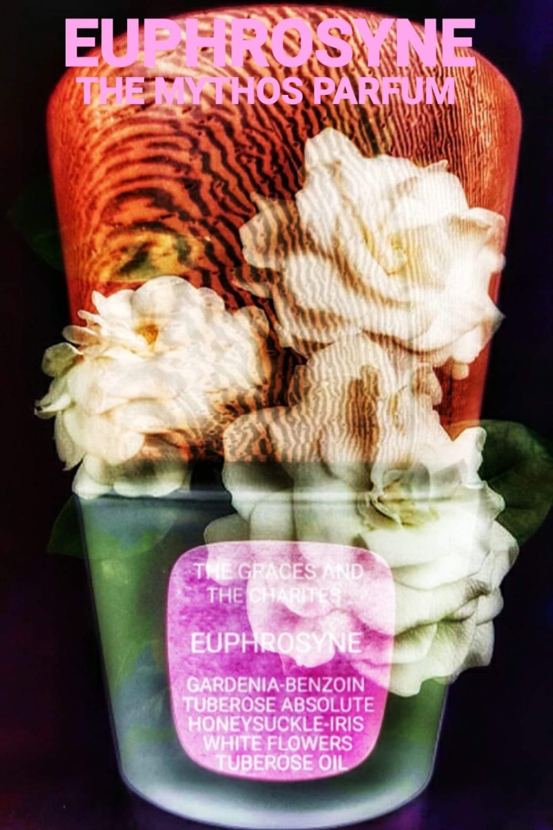 Eufrosine era la Grazia più festosa e gioiosa. Lei si occupava dello stato d'animo degli esseri umani facendoli rasserenare con profumi ed olii essenziali dei fiori più sensuali, carismatici e coinvolgenti! Delle tre ninfe, lei identificava la voluttà quindi il suo profumo femminile, opulento e ricco doveva assolutamente avere quella nota carnale-travolgente che si trova solo nella tuberosa! Il problema più grande di questa Grazia era che al suo passaggio riusciva ad allietare con i suoi profumi gli animi degli esseri umani ma allo stesso tempo turbava con i suoi aromi cosi intensamente che doveva sempre scappare velocemente dovendo rimanere pura essendo un'ancella inviolabile della corte di Apollo insieme alle Muse.
