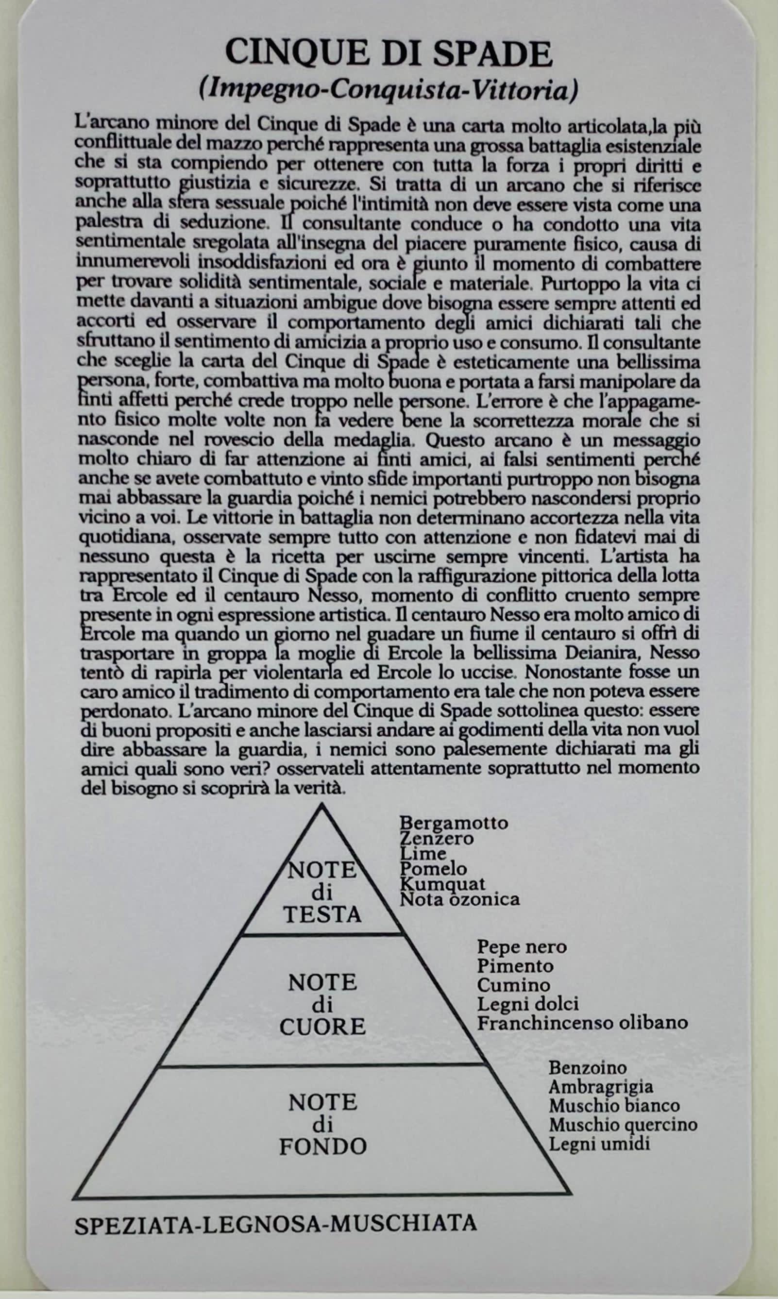 L'arcano minore del Cinque di Spade è una carta molto articolata, la più conflittuale del mazzo perché rappresenta una grossa battaglia esistenziale che si sta compiendo per ottenere con tutta la forza i propri diritti e soprattutto giustizia e sicurezze. Si tratta di un arcano che si riferisce anche alla sfera sessuale poiché l'intimità non deve essere vista come una palestra di seduzione. II consultante conduce o ha condotto una vita sentimentale sregolata all'insegna del piacere puramente fisico, causa di innumerevoli insoddistazioni ed ora è giunto il momento di combattere per trovare solidità sentimentale, sociale e materiale. Purtroppo la vita ci mette davanti a situazioni ambigue dove bisogna essere sempre attenti ed accorti ed osservare il comportamento degli amici dichiarati tali che sfruttano il sentimento di amicizia a proprio uso e consumo. II consultante che sceglie la carta del Cinque di Spade è esteticamente una bellissima persona, forte, combattiva ma molto buona e portata a farsi manipolare da finti affetti perché crede troppo nelle persone. L'errore è che l'appagamento fisico molte volte non fa vedere bene la scorettezza morale che si nasconde nel rovescio della medaglia. Questo arcano è un messaggio molto chiaro di far attenzione ai finti amici, ai falsi sentimenti perché anche se avete combattuto e vinto sfide importanti purtroppo non bisogna mai abbassare la guardia poiché i nemici potrebbero nascondersi proprio vicino a voi. Le vittorie in battaglia non determinano accortezza nella vita quotidiana, osservate sempre tutto con attenzione e non fidatevi mai di nessuno questa è la ricetta per uscirne sempre vincenti. L'artista ha rappresentato il Cinque di Spade con la raffigurazione pittorica della lotta tra Ercole ed il centauro Nesso, momento di conflitto cruento sempre presente in ogni espressione artistica. II centauro Nesso era molto amico di Ercole ma quando un giorno nel guadare un fiume il centauro si offrì di trasportare in groppa la moglie di Ercole la bellissima Deianira, Nesso tentò di rapirla per violentarla ed Ercole lo uccise. Nonostante fosse un caro amico il tradimento di comportamento era tale che non poteva essere perdonato. L'arcano minore del Cinque di Spade sottolinea questo: essere di buoni propositi e anche lasciarsi andare ai godimenti della vita non vuol dire abbassare la guardia, i nemici sono palesemente dichiarati ma gli amici quali sono veri? Osservateli attentamente soprattutto nel momento del bisogno si scoprirà la verità.