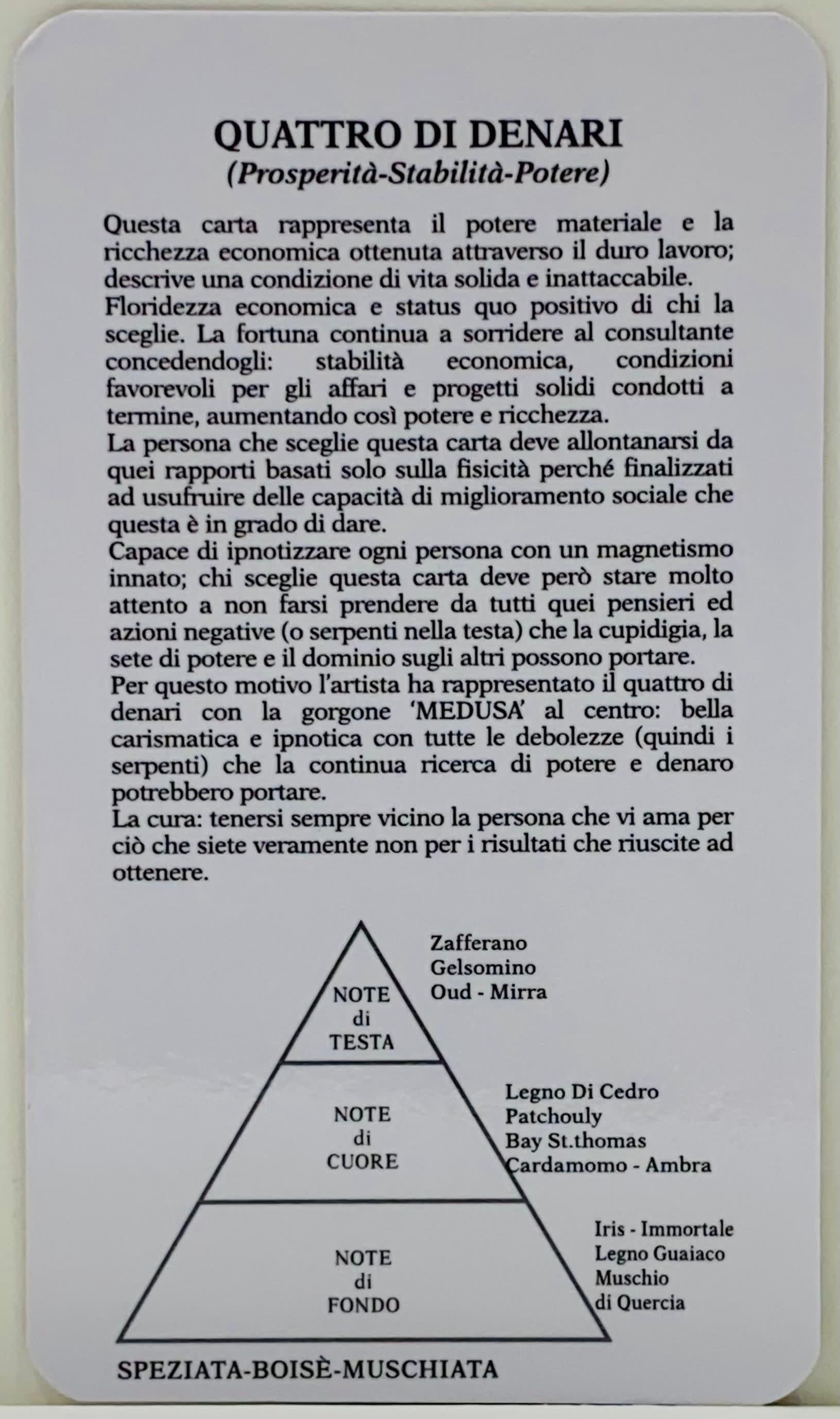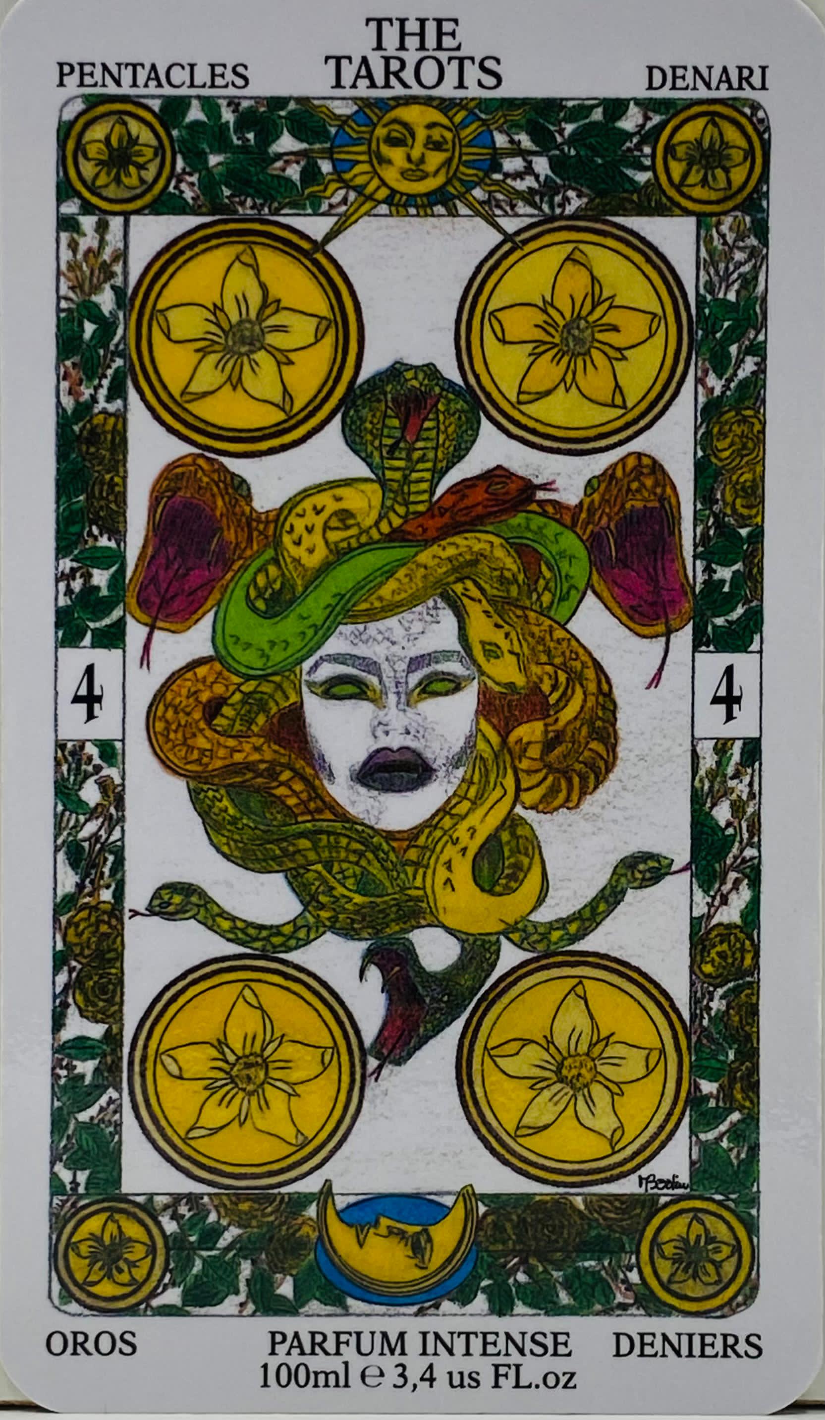 La carta del quattro di denari rappresenta una nuova visione più moderna e corretta di questo mito dove Medusa è una creatura bellissima,ipnotica e magnetica con un carattere fortissimo e dominante che non sacrifica assolutamente la parte sensuale e carnale che ogni donna potrebbe avere(per scelta)con il proprio uomo.