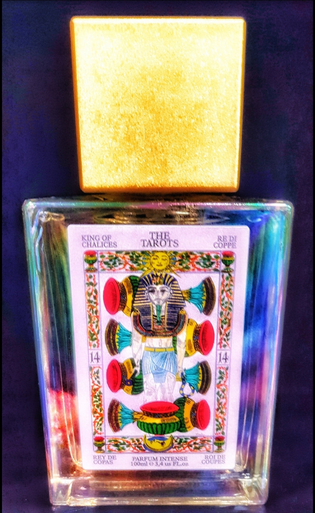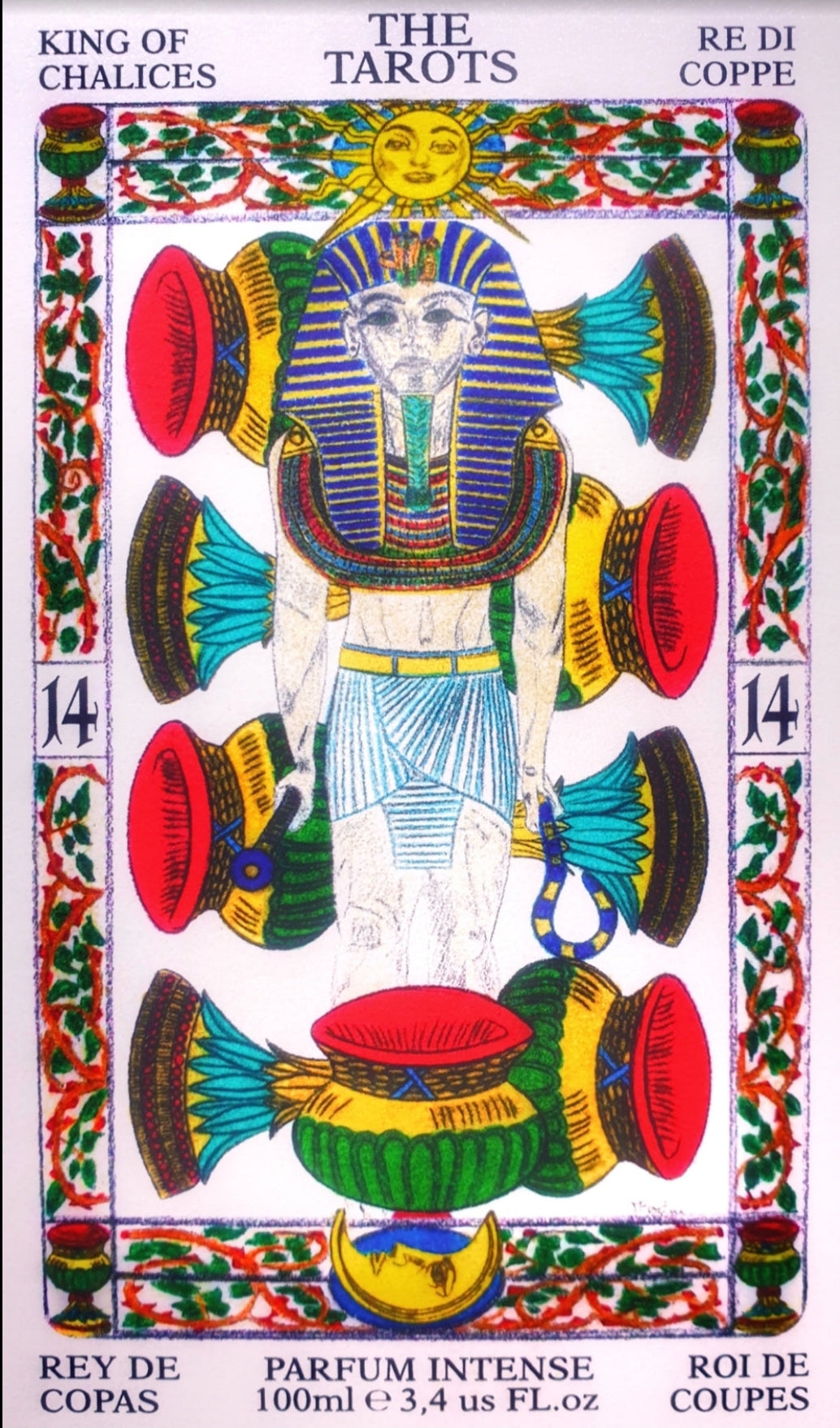 La carta-profumo n.14 degli arcani minori dei semi di coppe,della linea di profumeria artistica THE TAROTS PARFUM,il RE DI COPPE,significa: amore,lealtà e fiducia. Questa carta si riferisce ad una persona sincera ed onesta,dai sentimenti puri;è l'amico fedele,il compagno dei sogni,la persona che ama lavorare e si impegna ogni giorno per creare qualcosa di costruttivo per il futuro suo,del partner, dei familiari e di chi gli sta accanto con amore.Regale nei modi,nei pensieri e nei sentimenti ha una classe innata che lo contraddistingue e ciò ne fa di lui il re della realtà che si è creato intorno.Nella rappresentazione grafica il RE DI COPPE è stato identificato con uno dei più grandi re dell'antichità cioè il faraone TUTANKHAMON,figlio di AKHENATON e della misteriosa e bellissima NEFERTITI figlio di figure reali ai massimi livelli del potere dello stato più importante al mondo di quell'epoca storica. Nonostante l'immenso potere si trattava di un giovane e semplice re con un aspetto da fanciullo molto delicato e dolce.Fu vittima,a causa dei suoi sentimenti positivi verso gli altri,di trame di corte e nonostante la protezione della magica madre,legata all'elemento acqua,all'etericitá e ad ISIDE nulla valse per salvarlo dalla sete di potere e di gelosie che lo circondavano. Il RE DI COPPE rappresenta una persona pura di sentimenti e nobile d'animo che non può però mescolarsi tra la folla non curante di tanti malumori che i nobili sentimenti creano intorno a lui.Chi sceglie questa carta dovrà circondarsi di persone belle d'animo,con valori seri e puri di cuore.