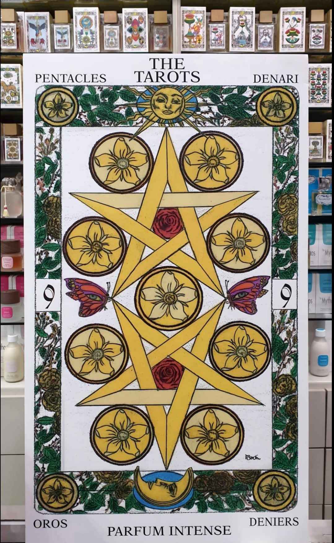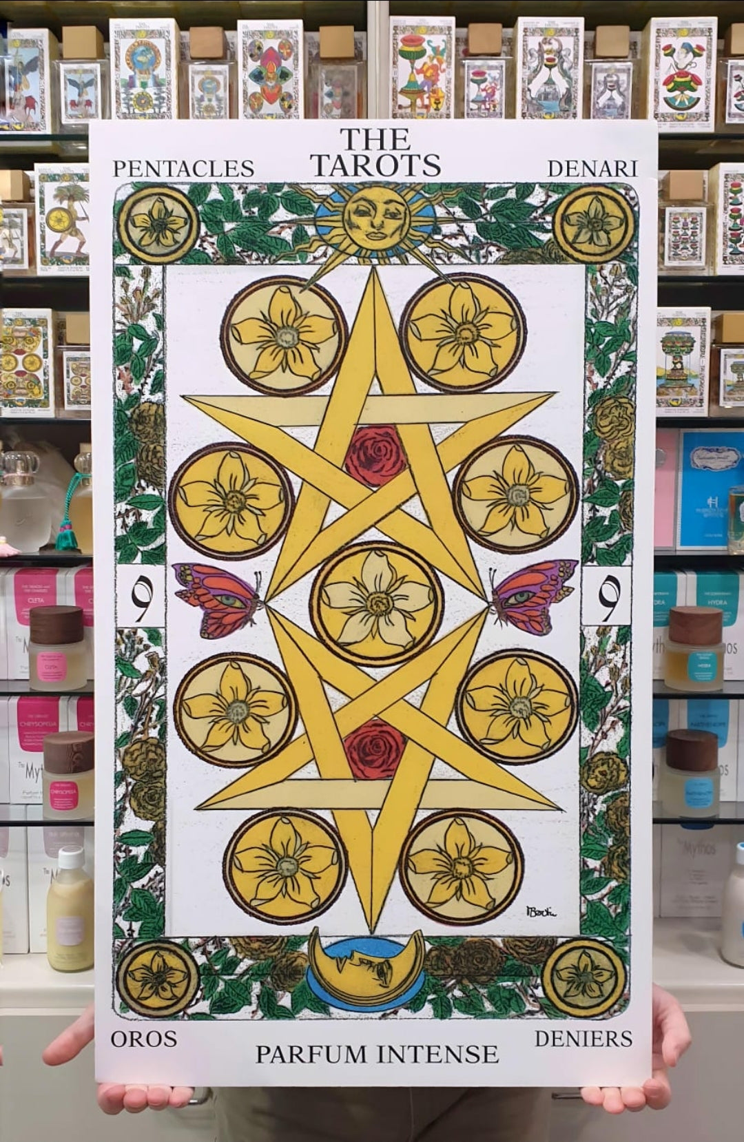 PANNELLI PER ARREDAMENTO DEGLI ARCANI MAGGIORI E MINORI DELLA LINEA THE TAROTS PARFUM in questo caso il NOVE DI DENARI