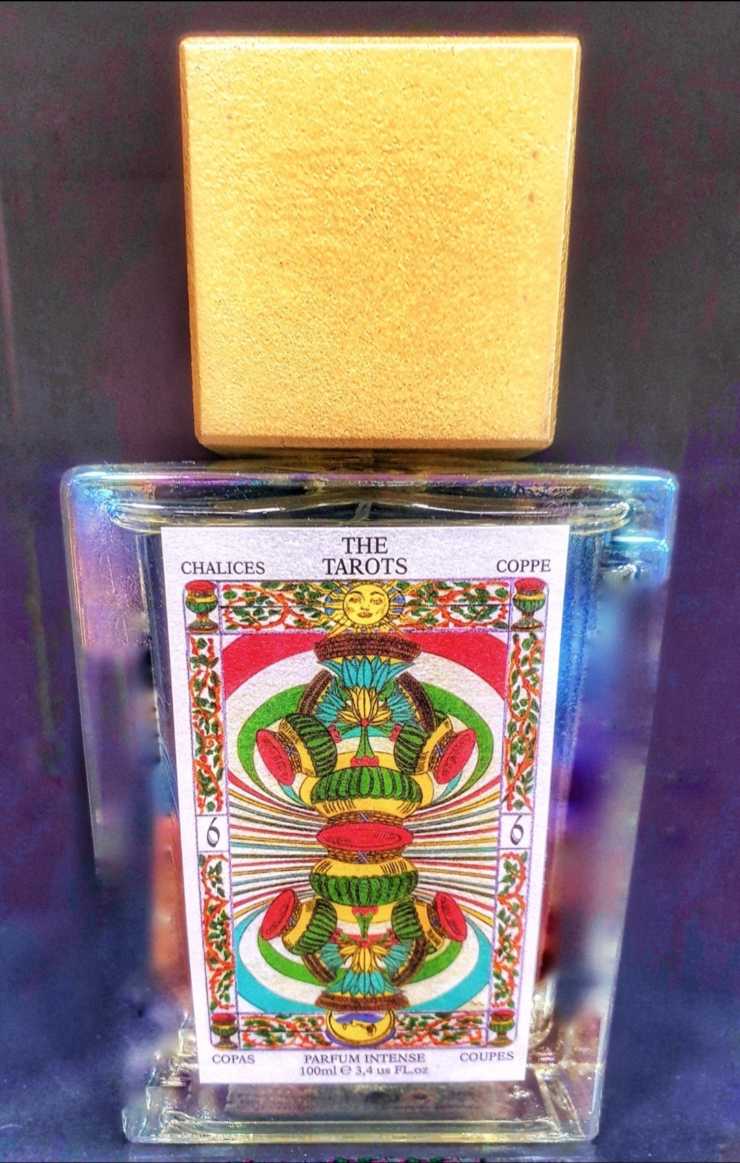 La carta-profumo N.6 della linea di profumeria artistica THE TAROTS PARFUM degli arcani minori dei semi delle coppe significa:bellezza,armonia, attrazione.Questo arcano minore descrive l'attrazione,forte,pura e divina che c'è tra i poli opposti sia nel mondo fisico che spirituale,sia nel mondo sentimentale che razionale.Il sei è il numero della Creazione associato all'amore fisico e spirituale,che viene rappresentato da due triangoli i cui vertici opposti creano un flusso armonioso tra ordine fisico e spirituale. La persona che sceglie questa carta è dominata dalla bellezza,dalle pulsioni e debolezze che questo comporta.Un flusso di energie cosmiche,uno scontro tra galassie che fa nascere le sei coppe, divise in due gruppi speculari ed ognuna è il punto cardinale da cui si formeranno poi i due triangoli opposti dell'attrazione magnetica della vita.Due poli opposti che si attraggono magneticamente, formati ognuno da un triangolo i cui punti di nascita sono le coppe che rappresentano il corpo,la mente e il cuore della coppia che si attrae vicendevolmente.Tutto ciò significa che il turbinio di passioni,sia interne che esterne,che vive il consultante,determina l'equilibrio di energie che costituisce l'armonia della vita.