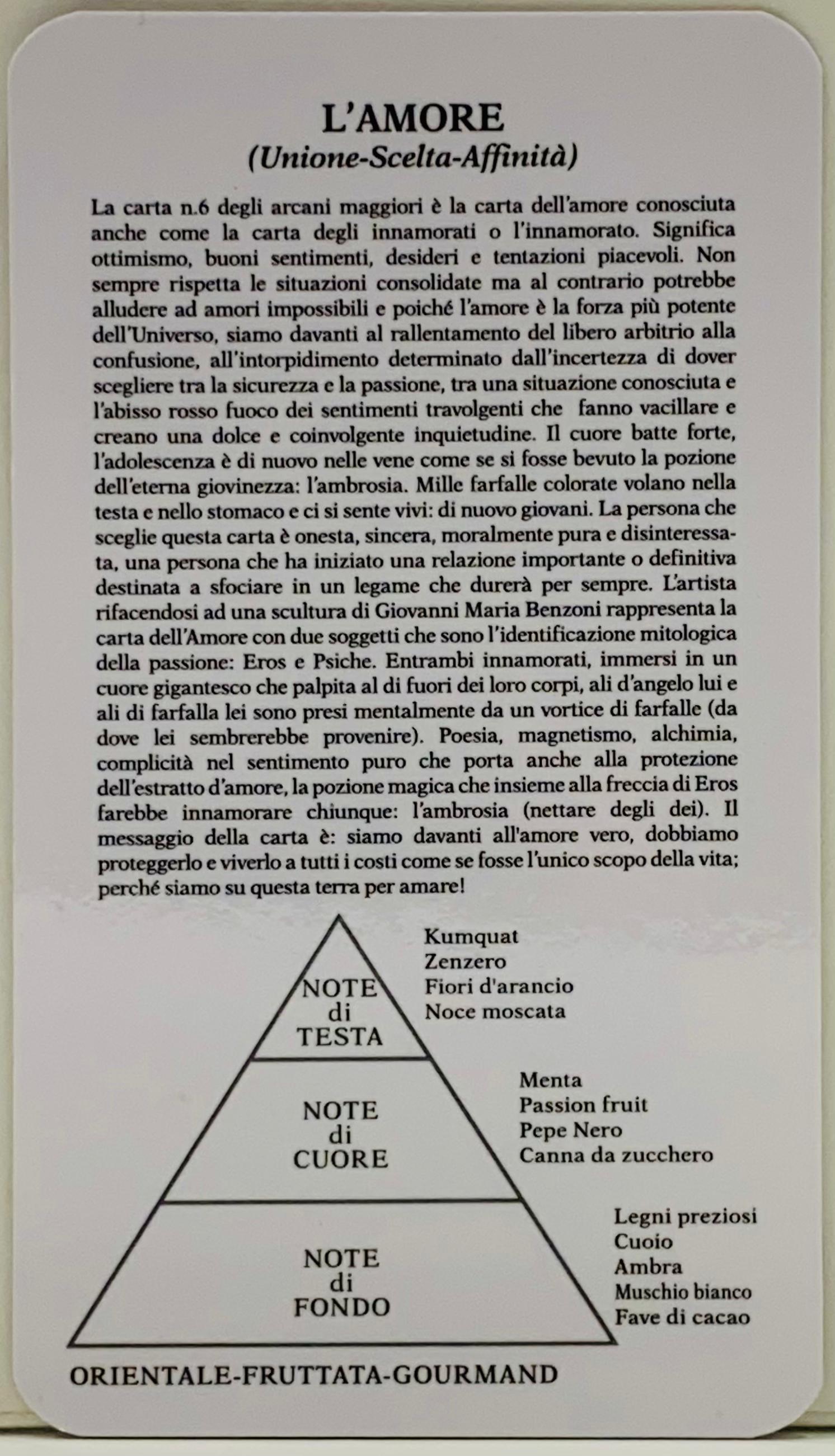 Questa carta/profumo che corrisponde al N.6 è l'arcano che sottolinea il sentimento puro,e l'amore vero di due innamorati.Il profumo che descrive "L' AMORE" è avvolgente,sensuale,esplosivo,