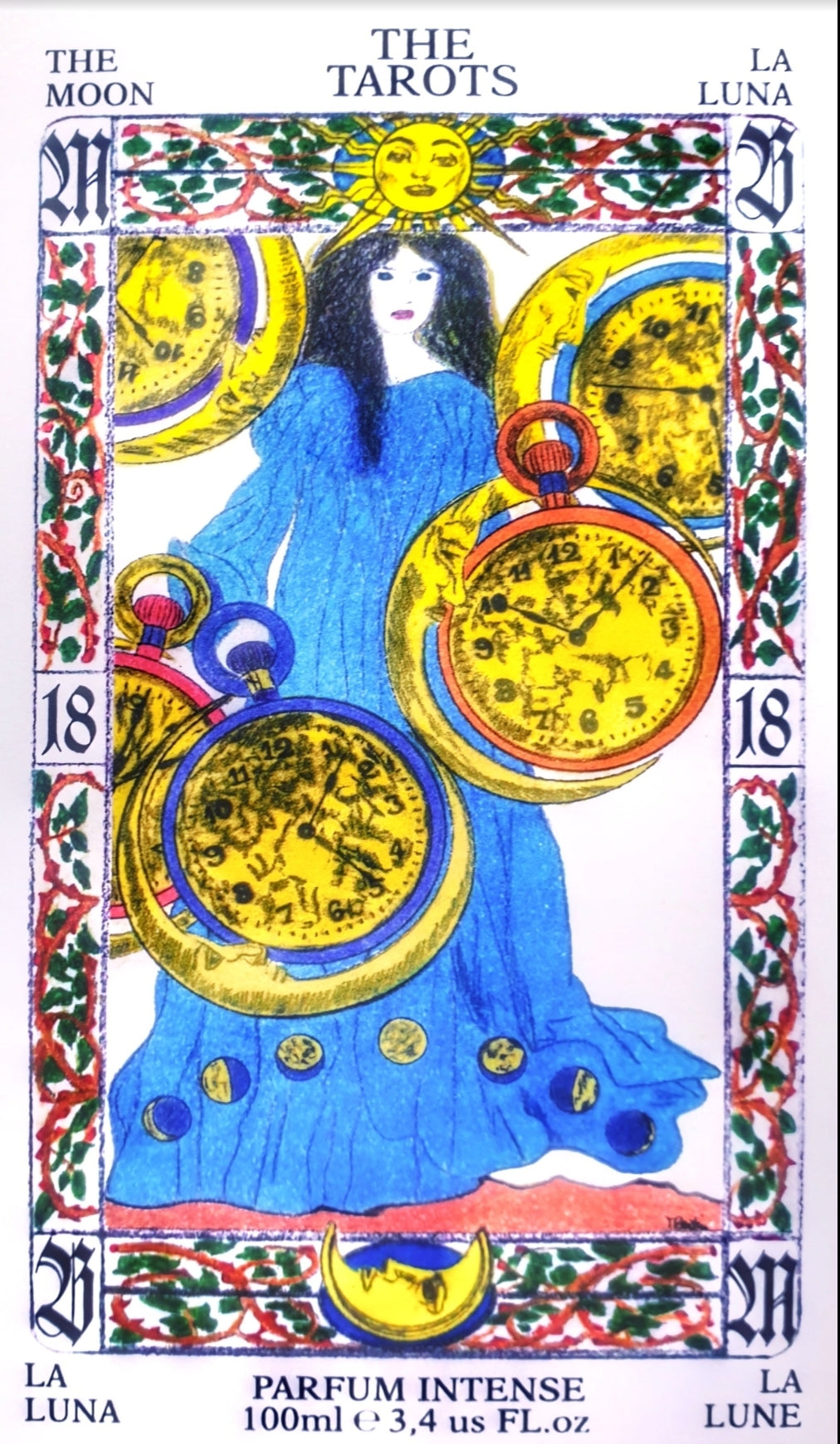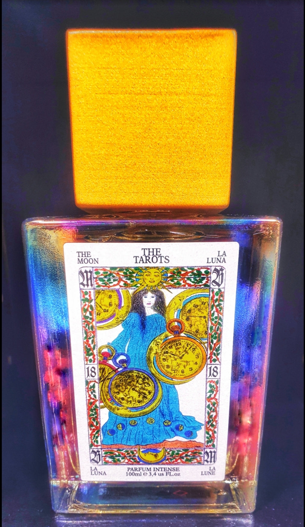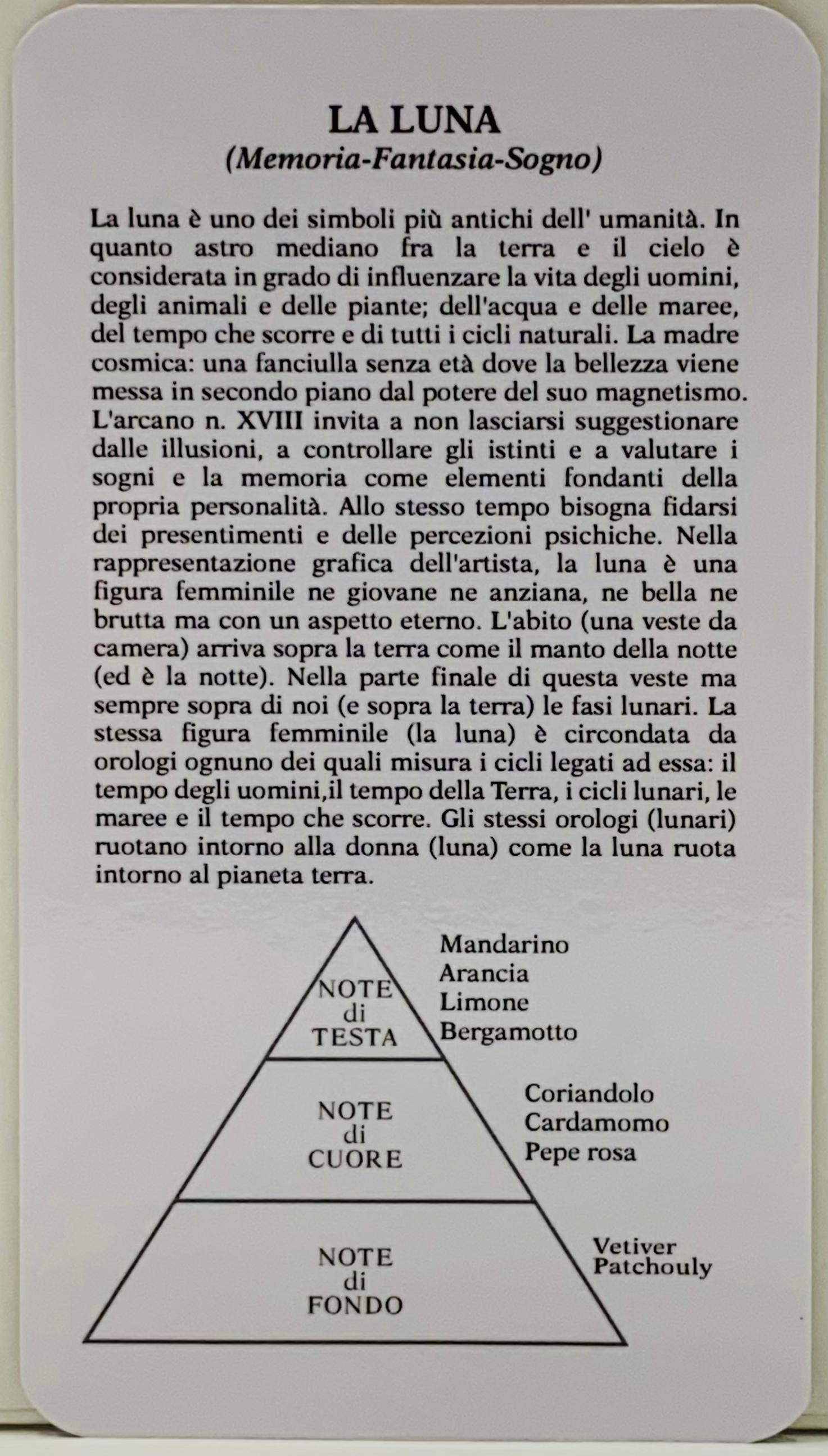La carta-profumo N.18,LA LUNA,degli arcani maggiori della linea di profumeria artistica THE TAROTS PARFUM,significa memoria,fantasia,sogno.LA LUNA è uno dei più antichi simboli dell'umanità,astro mediano tra cielo e terra,è sempre stata in grado di influenzare la vita degli uomini,degli animali e delle piante,delle maree e dell'acqua in generale,del tempo che scorre e di tutti i cicli naturali.Si tratta della madre cosmica,di una fanciulla senza età in cui la bellezza viene messa in secondo piano dal suo potente magnetismo.Questo arcano maggiore invita a non lasciarsi suggestionare dalle illusioni,a controllare gli istinti e a valutare i sogni e la memoria come elementi fondanti della propria personalità;bisogna fidarsi dei presentimenti e delle percezioni psichiche soprattutto sotto l'egida di questa donna eterna che risplende nel cielo.La luna costituisce di per sé un orologio astronomico con tutti i cicli legati alle sue rotazioni ciò vuol dire che anche se una cosa sembra eterna il tempo scorre per tutti e per tutto, per cui bisogna vivere ogni momento al massimo delle emozioni poiché tutto passa nulla rimane uguale o per sempre.