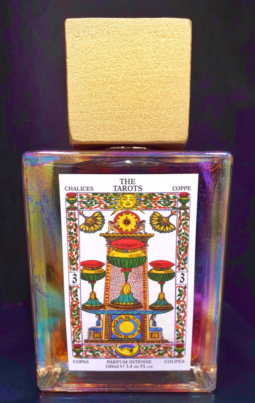 La carta-profumo del TRE DI COPPE, della linea di profumeria artistica THE TAROTS PARFUM,appartenente agli arcani minori dei semi delle COPPE significa potenza ed energia.La carta del TRE DI COPPE significa realizzazione a livello affettivo,il trionfo e il raggiungimento della meta o la felice conclusione di un progetto dopo un grande conflitto completamente superato.La trinità interna nell'essere umano:cuore,mente e corpo.Il tempo scorre inesorabile(coppa grande)e comanda sul corpo si nota di più ma nella realtà e la più crudele,inesorabile. Le altre due coppe sono più piccole ma le più vicine ad ogni momento della nostra vita e sono sorrette sempre una dalla nostra mente,l'altra dal nostro cuore.Le due coppe più piccole sovrastano l'essere umano che ne sorregge il peso,come i nostri pensieri e i nostri sentimenti.La coppa più grande è incassata all'interno dell'obelisco è distaccata da noi,è il tempo che viviamo costantemente ma non ne abbiamo contatto,sovrasta tutto e tutti è dentro ogni cosa e vive di vita propria ineluttabile.Per gli antichi egizi era il dio "RA" e nel periodo del faraone AKHENATON si pensava addirittura che il dio "RA" vivesse all'interno della struttura dell'obelisco.Questo arcano significa che non bisogna mai perdere tempo per raggiungere gli obiettivi perché il tempo non aspetta nessuno,neppure se stesso.