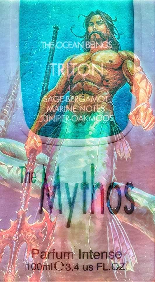 Tritone è il figlio di Poseidone (dio del mare) e della ninfa oceanica Anfitrite sua sposa. Il suo corpo veniva raffigurato nella tradizione per metà umano e dalla vita in giù a forma di pesce. Una versione maschile delle sirene; occhi, capelli e corpo(squamato), del colore verde/acqua del mare. Portava sempre con se un corno di conchiglia con il quale soffiandoci dentro, secondo il suono che il corno produceva,aveva il potere di calmare le tempeste, comunicare con i venti, con i mari e gli esseri che li abitavano in più aveva anche il compito di annunciare l'arrivo del dio del mare: suo padre Poseidone. Tritone veniva sempre rappresentato in statue, mosaici, affreschi e dipinti nei luoghi più importanti delle città antiche poiché era di buon auspicio; proteggeva la pesca e l'acqua e manteneva abbondanza di pesci per mangiare. Avere una statua del Tritone significava che la città era opulenta e i cittadini vivevano bene. Nella metamorfosi del mito legato all'evoluzione il Tritone' è diventato sempre più l'idealizzazione dell'uomo dal fisico perfetto; gran nuotatore, bravo pescatore, bello, atletico, affascinante e sempre circondato dalle ninfe più belle per le sue doti amatorie. Come le sirene nella terraferma aveva l'aspetto di un ragazzo magnifico e nell'acqua si strasformava in 'MERMAN(cioe' tritone con il significato di uomo sirena o essere per metà uomo per metà pesce). La fragranza Triton rappresenta l'odore del mare aperto, sconfinato, l'oceano. Salvia, pompelmo, limone e bergamotto nelle note di testa per identificare l'odore del mare blu/verde sotto il sole estivo. Note marine, alghe e ginepro nel cuore del profumo rendono perfettamente l'idea di questo mare profondo dove vive Tritone nel suo palazzo d'oro. Pepe nero,vetyver e muschio d'albero definiscono il carattere irruento, fresco e sensuale di questa creatura cosi bella ambita da tutte le sirene. Triton è il profumo del mare aperto,l'odore di una giornata passata in mezzo ai flutti e alle onde, la fragranza del corpo sinuoso che nuota nellacqua.